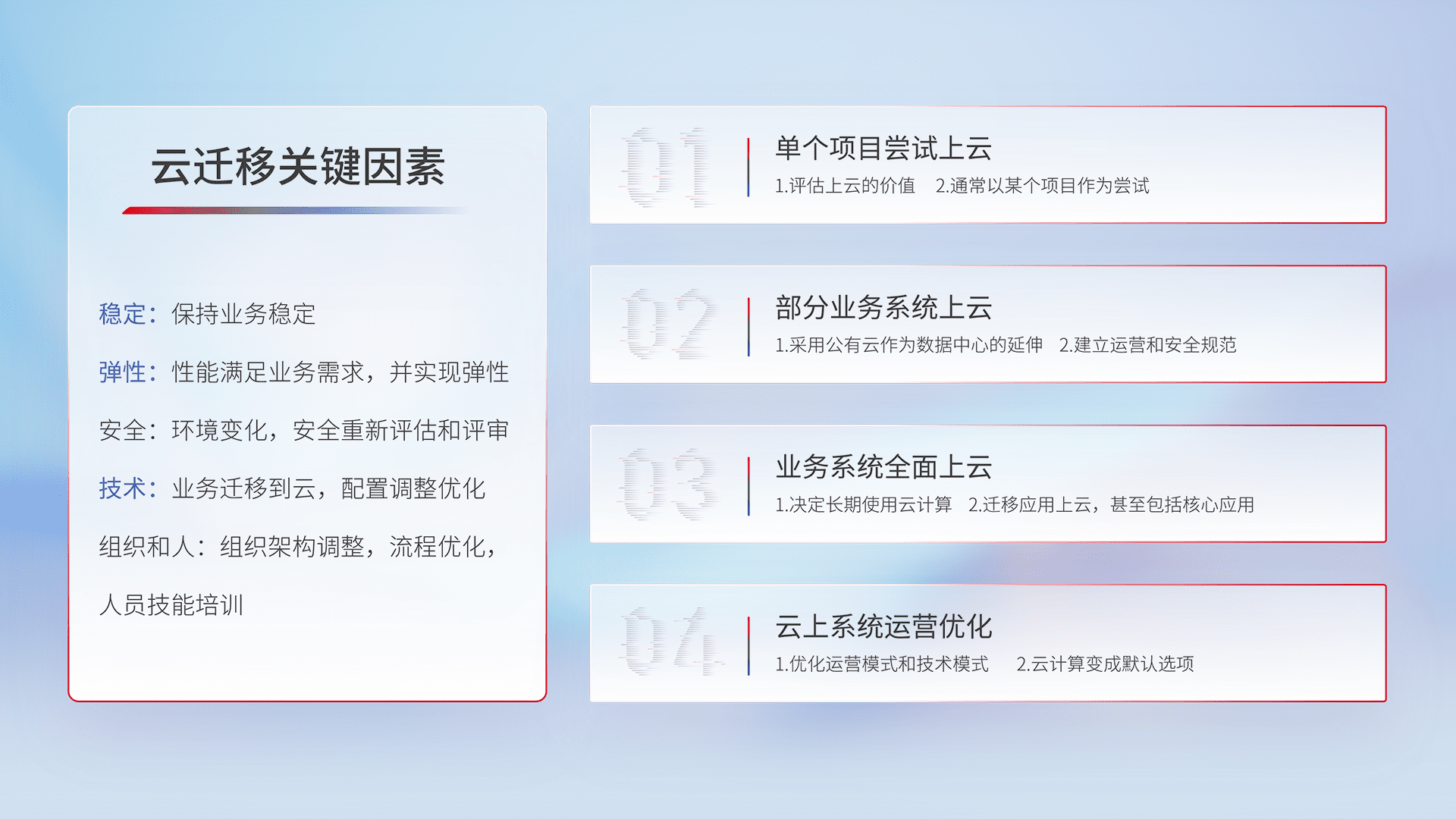 结合实际业务,,,从规划设计、、、云平台选型、、、、云原生改造、、数据迁移、、、、集成交付,,,迁移全过程为客户识别最佳上云路径,,做好风险识别管理,,,设计网络架构、、身份权限、、、、安全审计合规、、操作审计、、、日志审计、、监控告警策略、、、多站点容灾设计等,,,对云上基础设施进行整体规划,,,,提升IT治理水平,,以满足弹性、、、、高可用、、、高性能的需求。。。